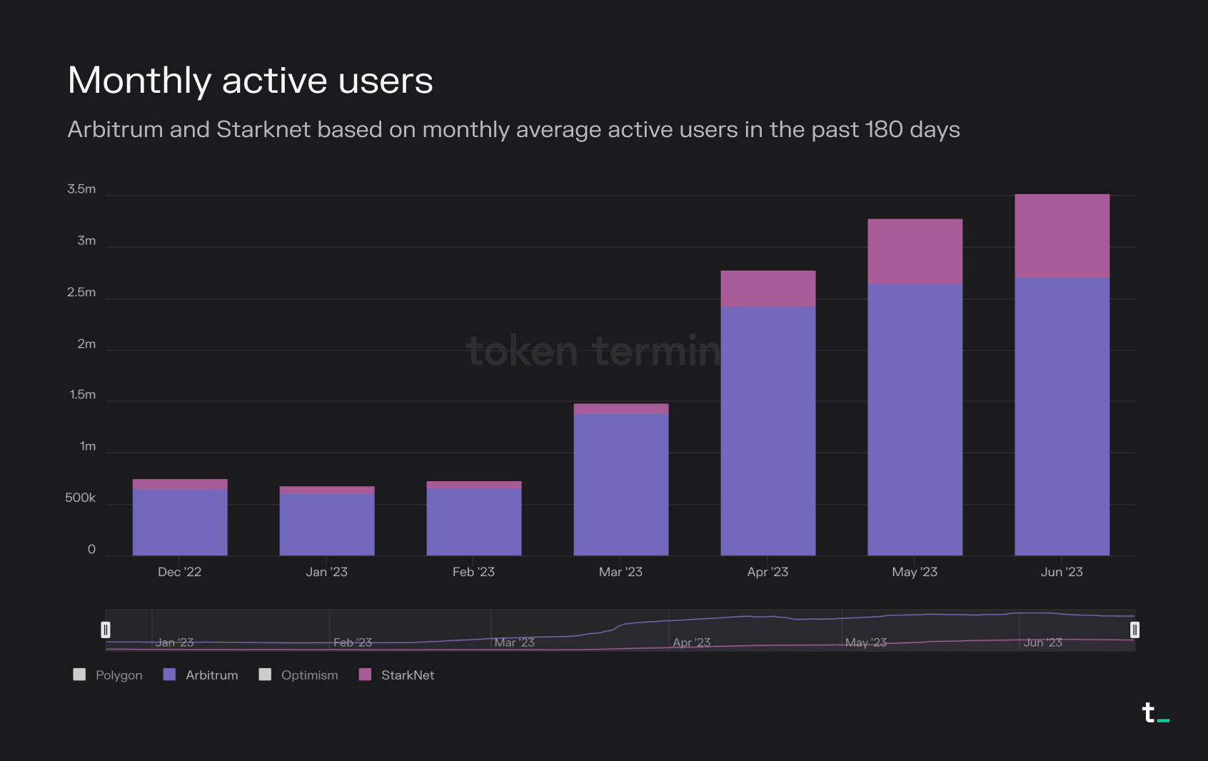 - The blockchains (L2) dashboard features 4 projects: Arbitrum, Optimism, Polygon, and Starknet. There are numerous L2 projects not yet listed on Token Terminal, so the dashboard can only give an indicative analysis of the market sector.