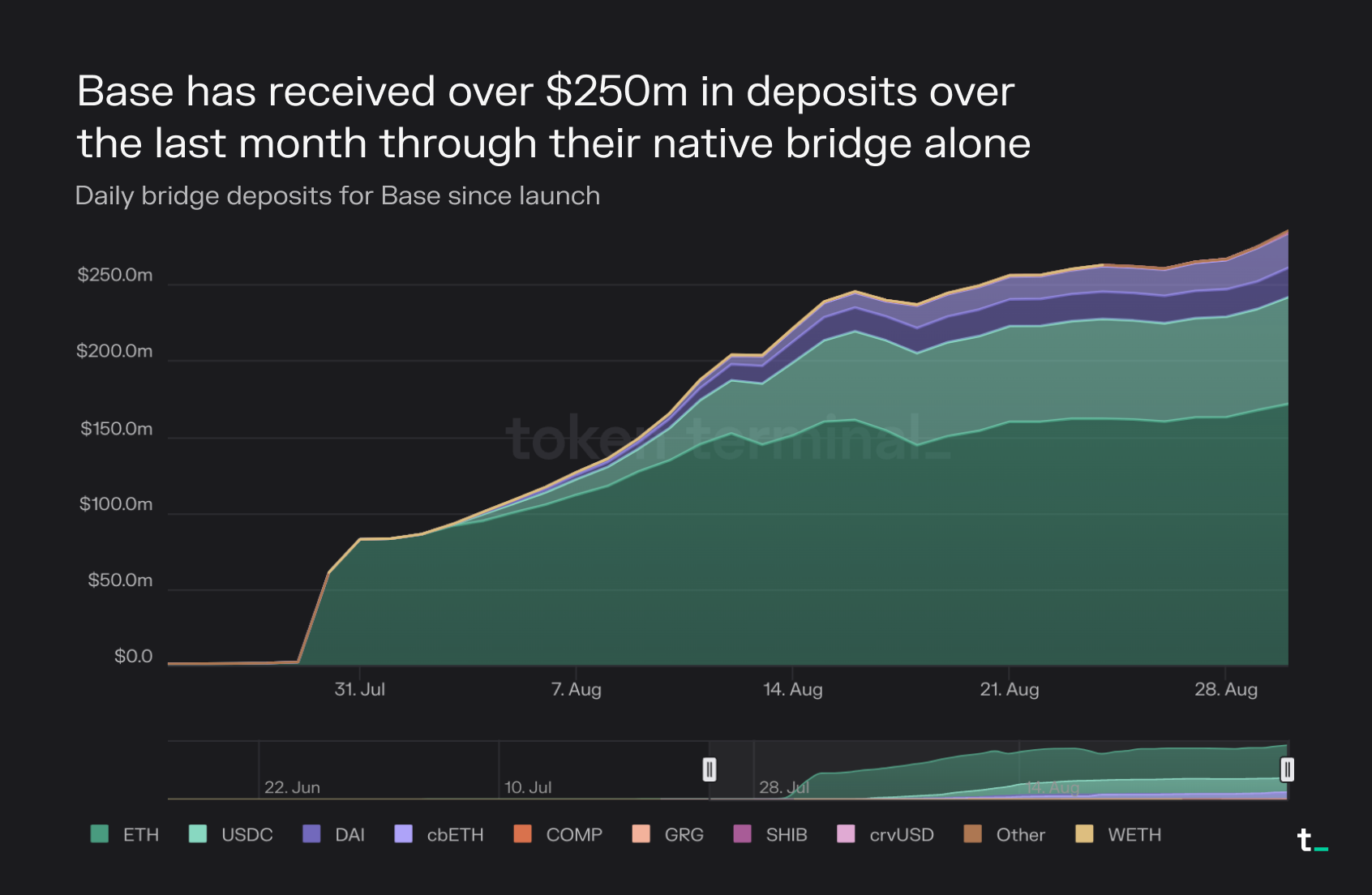 - Base has received over $250m in deposits over the last month through their native bridge. Base is a blockchain (L2) launched by centralized exchange Coinbase using the OP stack. The official Base-to-Ethereum bridge launched in July. Although bridging back from Base to Ethereum was released later on August 9th, Base showed a continuous upward trend in deposits.