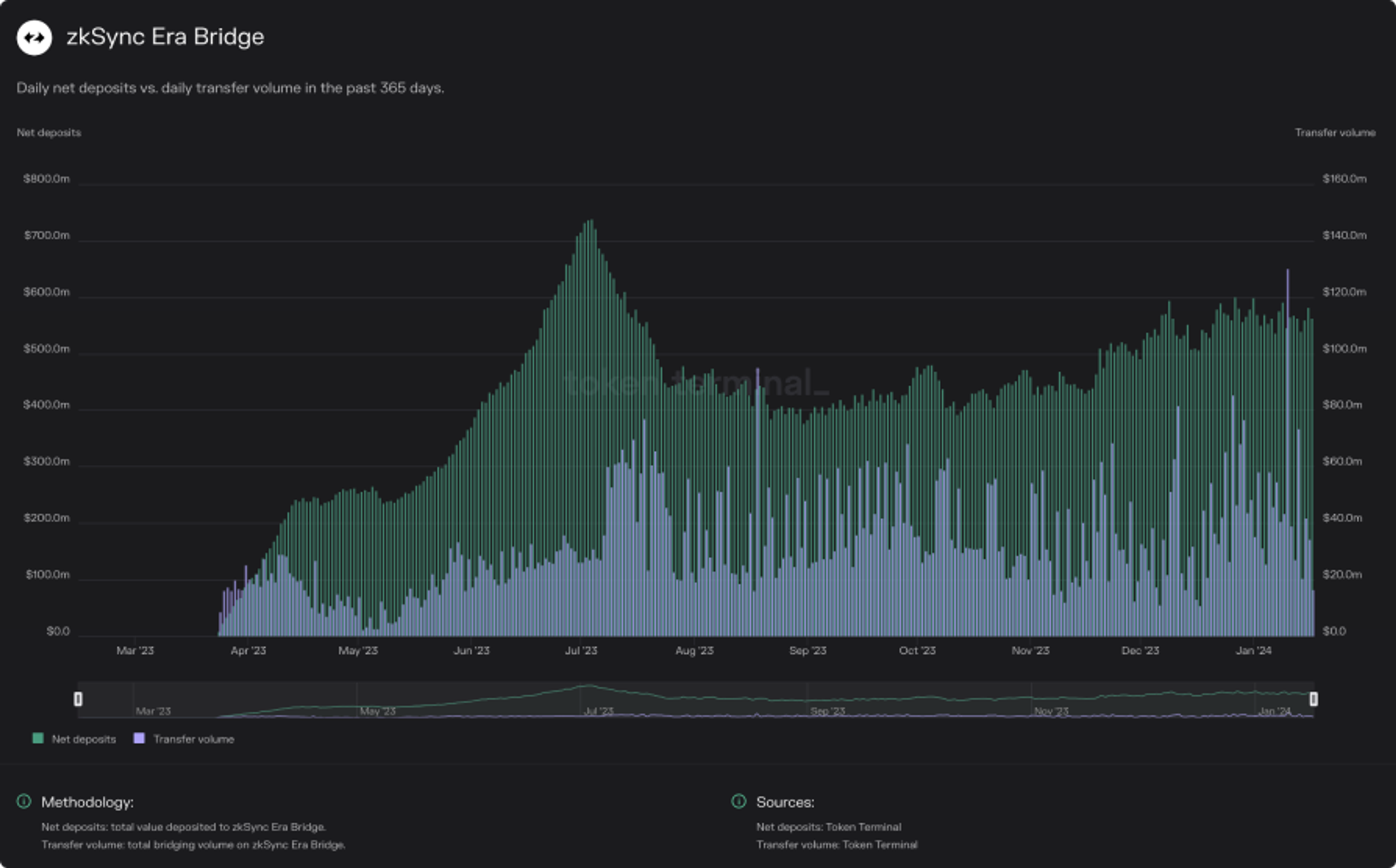 - zkSync Era mainnet launched in March '23. The peak in net deposits on the zkSync Era Bridge in July '23, exceeding $800 million, was driven by a surge in onchain activity, following the network's successful launch in March '23.