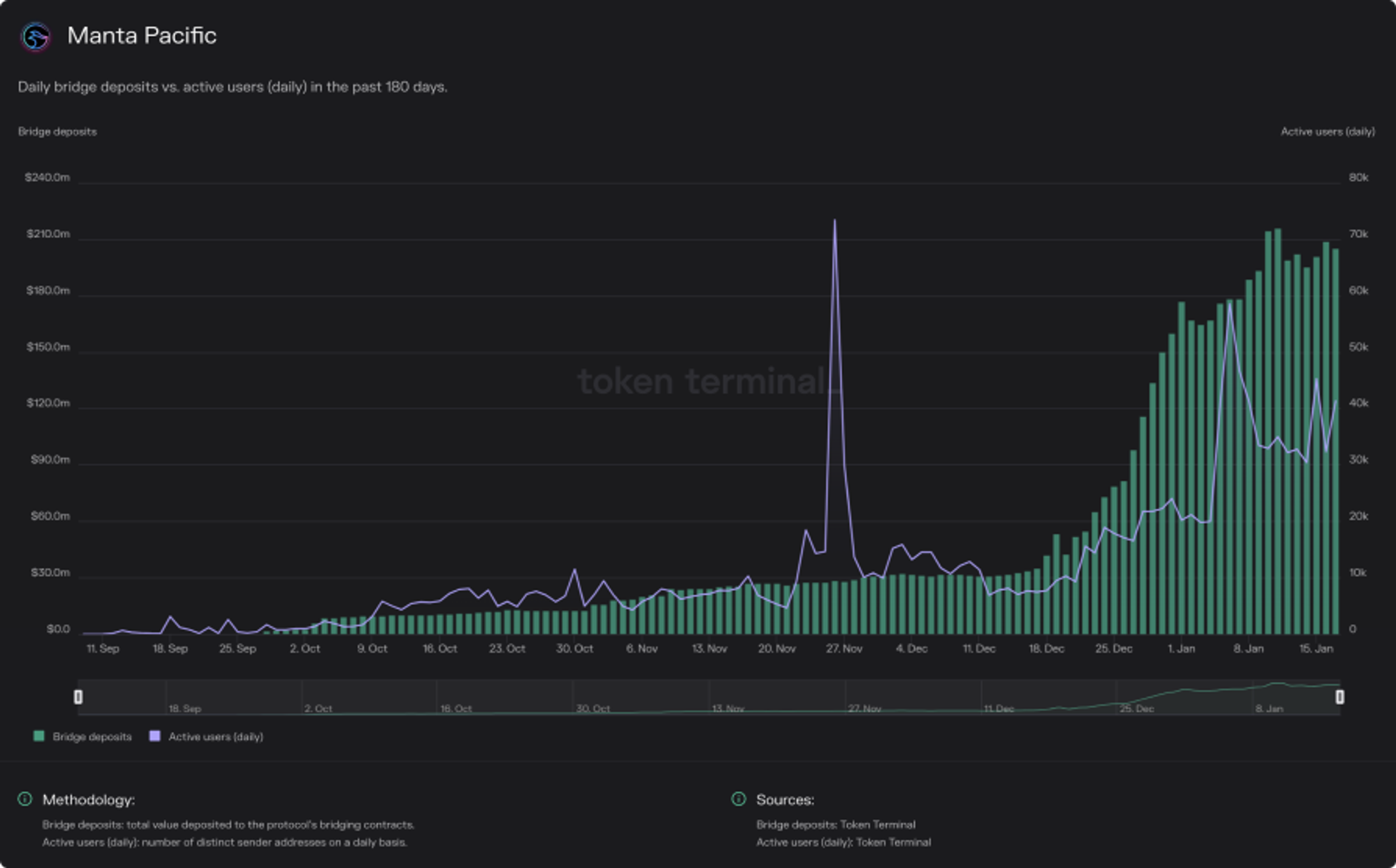 The total value deposited to Manta Pacific's bridging contracts is up 390% over the past 30 days. The above chart shows a surge in bridge deposits beginning halfway through December '23, growing exponentially to over $200 million today. The daily active users (DAU) count has also followed this trend, with an outlier spike in late November '23, peaking at over 73K.
