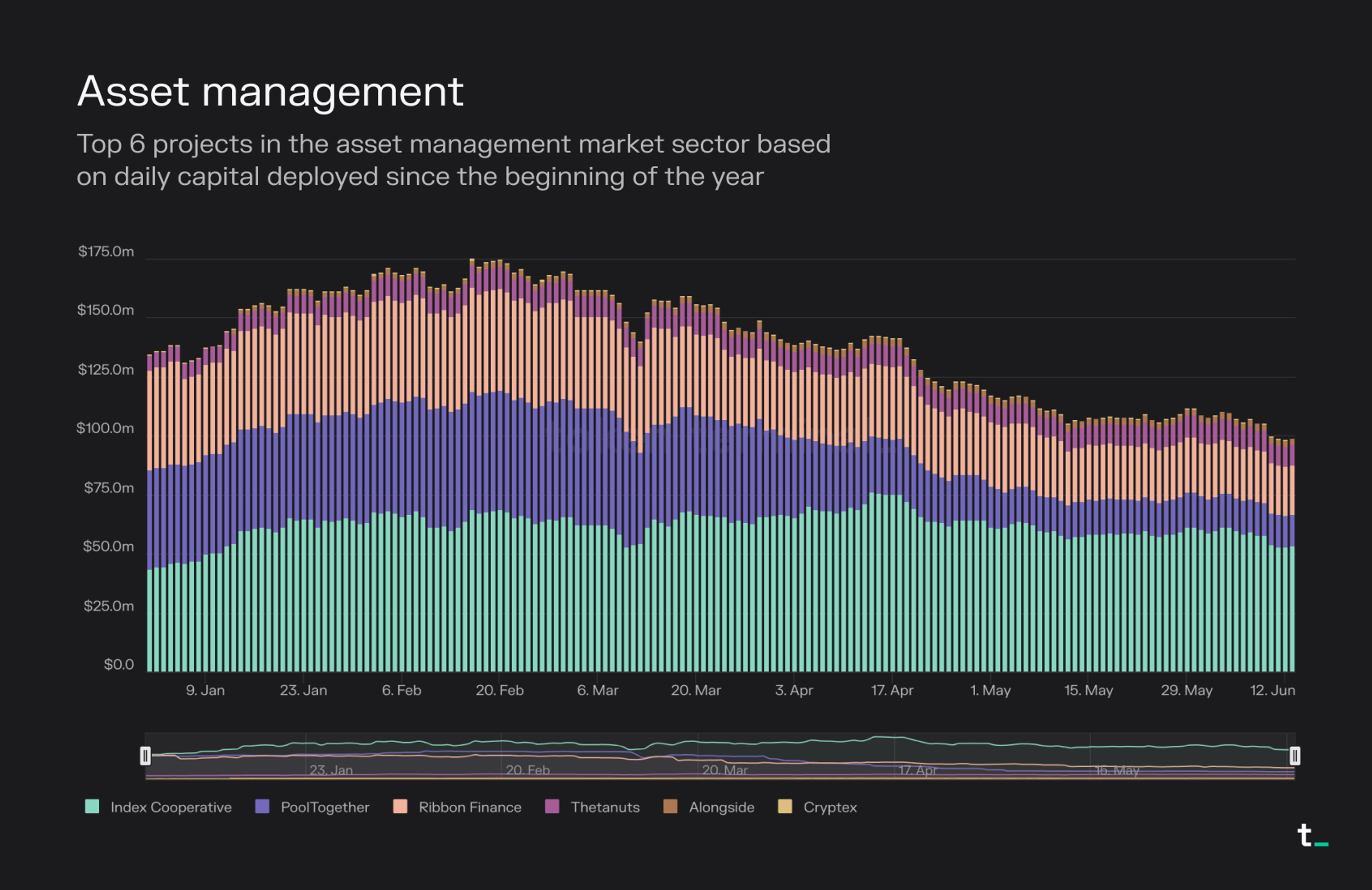- Alongside launched the Alongside Crypto Market Index, a market-cap weighted basket of 25 assets. Currently the AMKT index has about $2.6m in capital deployed.