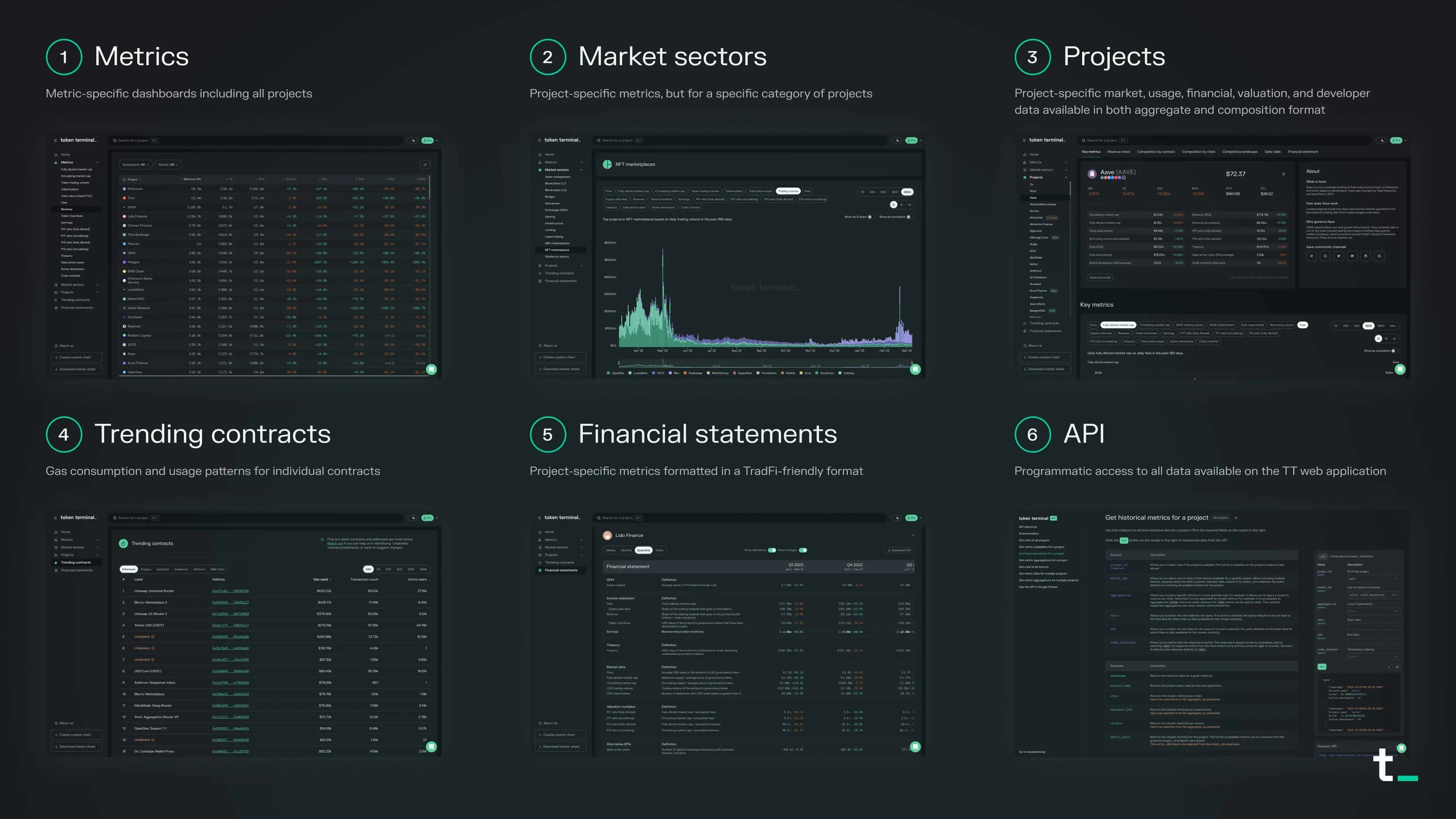 There are currently six different ways to interact with onchain data on Token Terminal: